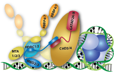 The NuRD complex comprises MBD2 or MBD3 and at least five additional proteins, each of which have multiple isoforms: HDAC1/2, RBBP4/7, MTA1/2/3, GATAD2A/B, and CHD3/4. We have been focusing our efforts on understanding how the MBD2/3 proteins bind and distribute on DNA and how they interact with other members of the complex.