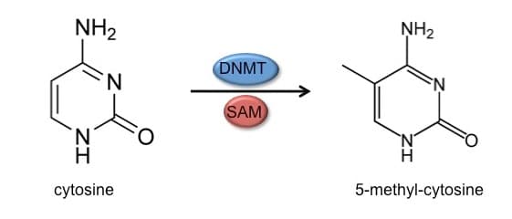 DNA methylation involves the addition of a methyl group to the C5 position of a cytosine base. This modification occurs in the context of CpG dinucleotides in double-stranded DNA in which the symmetrically related cytosines are methylated. This modification can be maintained across cell division since each daughter cell inherits one of the methylated strands.